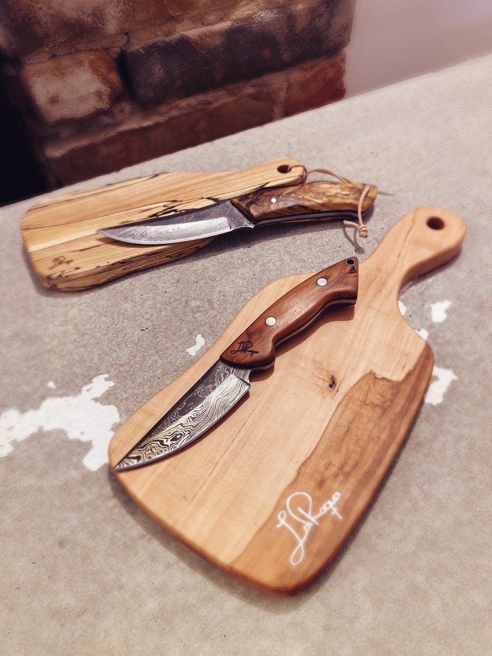 Die Messer haben mein Logo graviert, die Brettchen haben ein Perlmutt-Inlay eingesetzt.