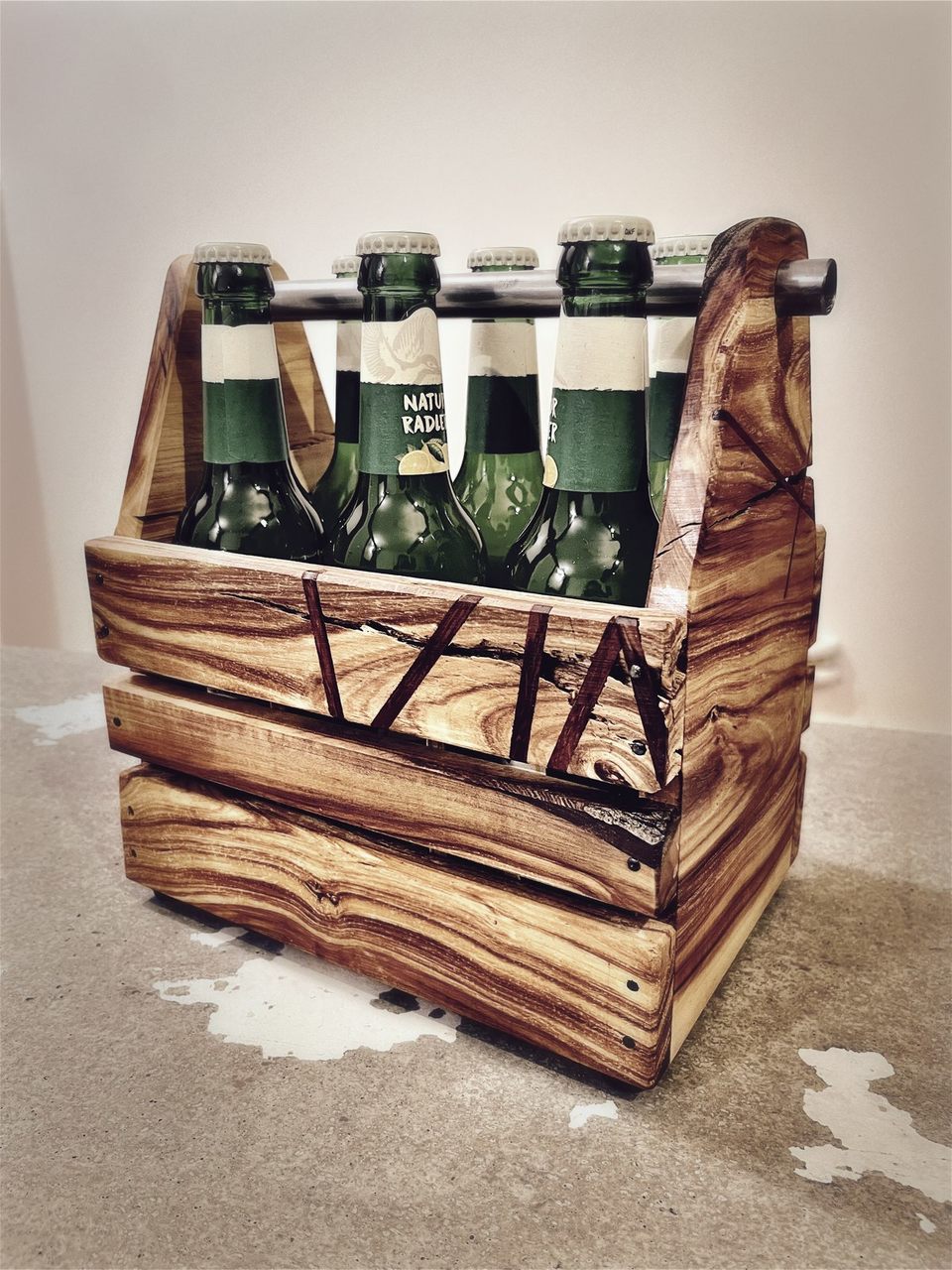 Als Griff habe ich ein Rohstahlrohr verwendet. Die Einlage fĂĽr die Flaschen im Inneren besteht aus Pappelsperrholz. An