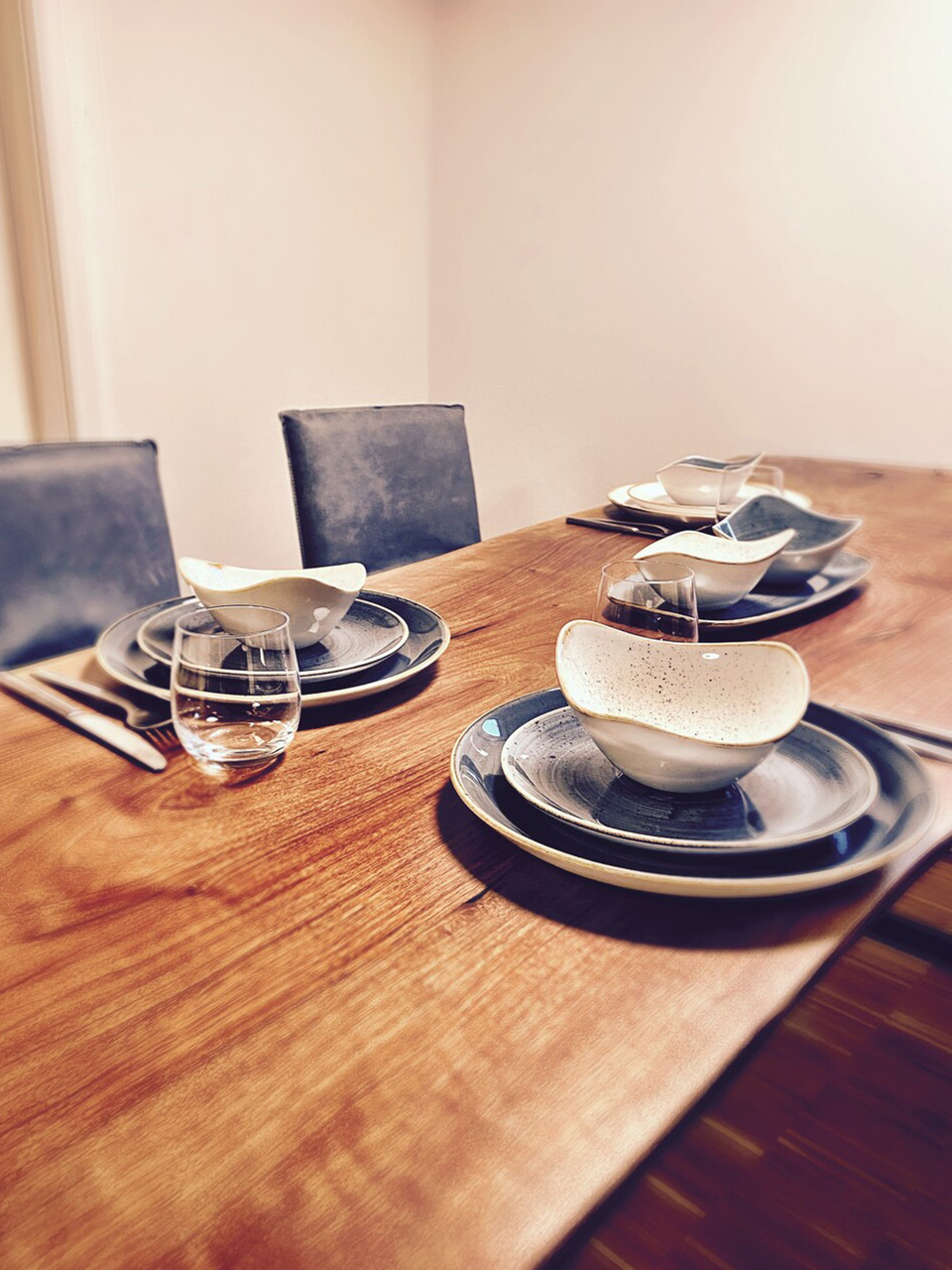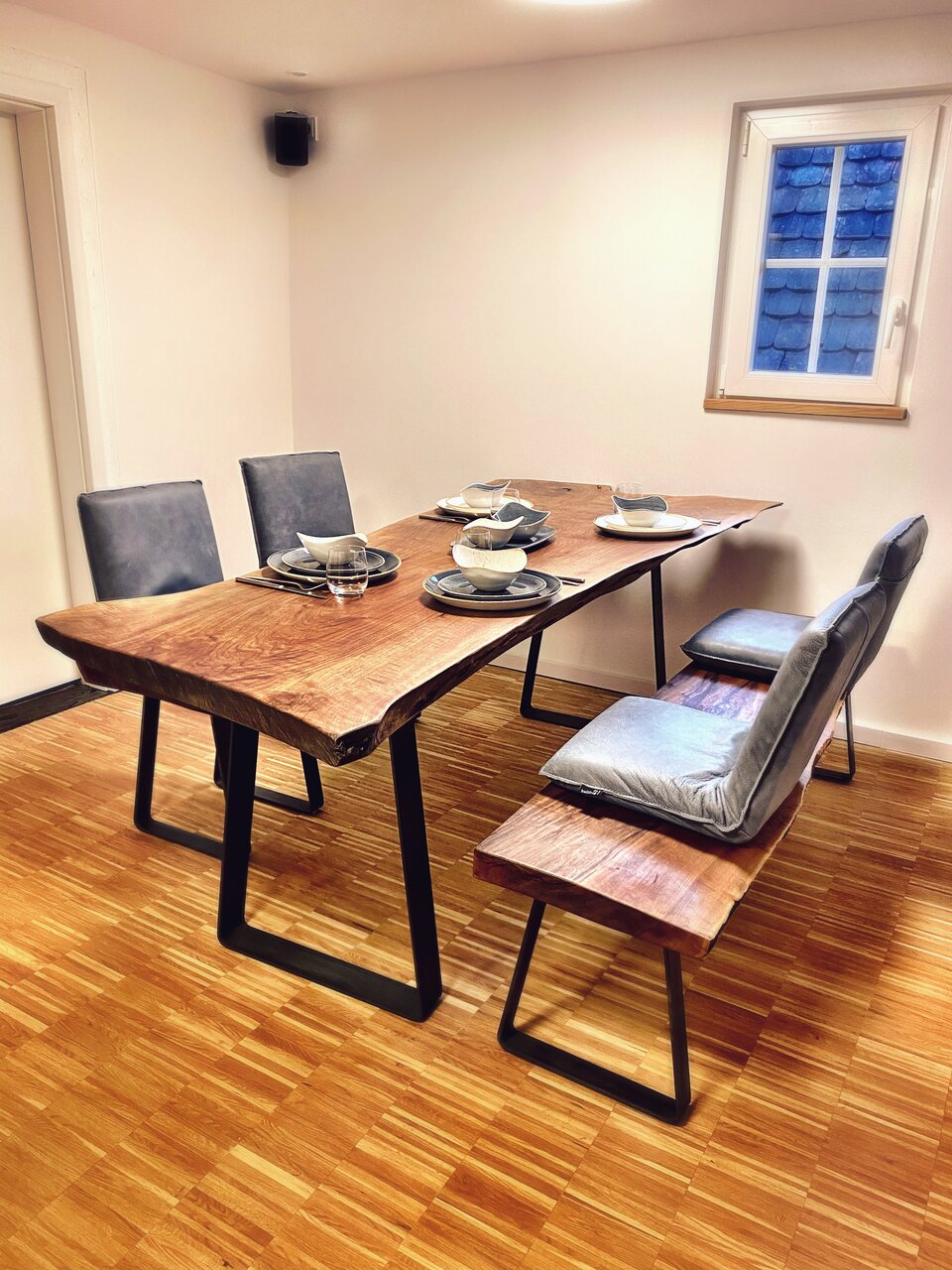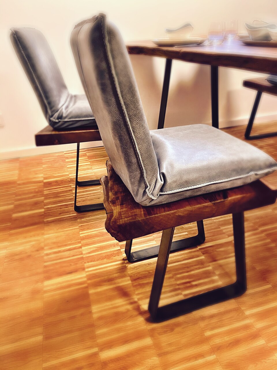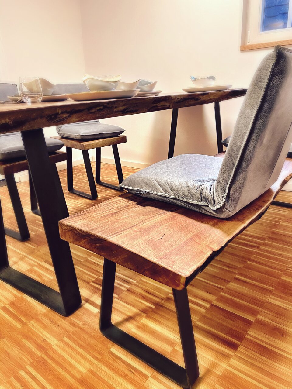 Ein Öl-Finish und Beine aus Rohstahl - leicht trapezförmig - runden das Projekt ab. Insgesamt stecken mehr als 35 Arbeitsstunden in dem Set.